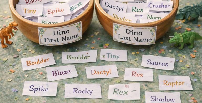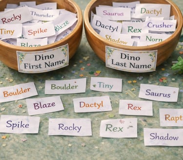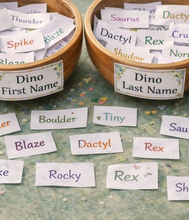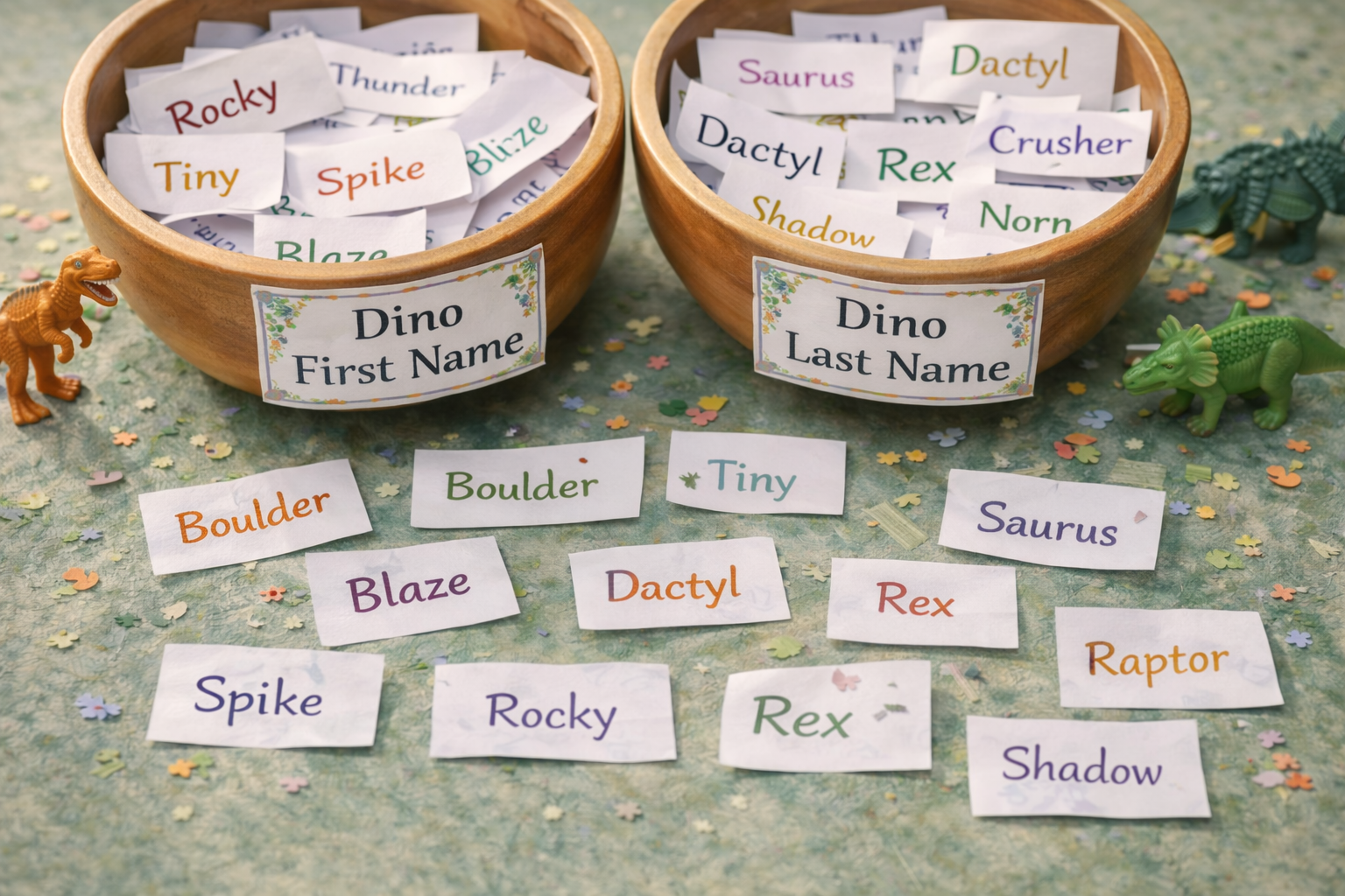 Each child picks one slip from each container to create their full dinosaur name (example: Thunder-Rex, or Tiny-Dactyl)