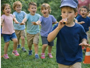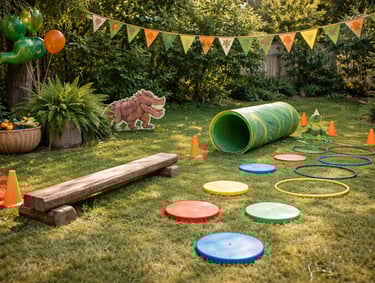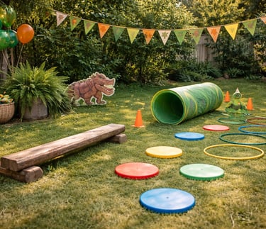 A high-energy dinosaur obstacle course where kids jump, crawl, and balance through prehistoric challenges.