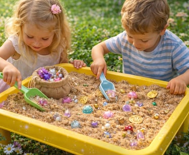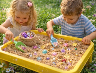 Fairies dig through sand to uncover sparkling jewels and fairy treasures.