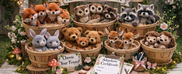 Create a cozy "adoption center" woodland display using baskets, moss, or soft fabric.