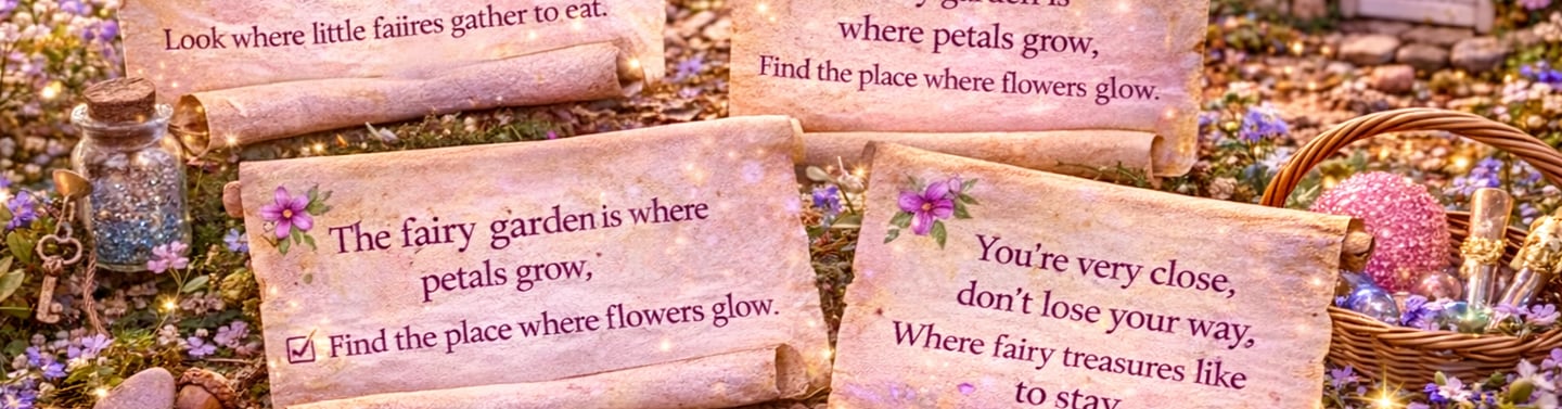 Sample Clue 3 "The Fairy Garden is where petals grow, find the place where flowers flow" Where to hide the next clue: By flowers, plants, or a garden area.