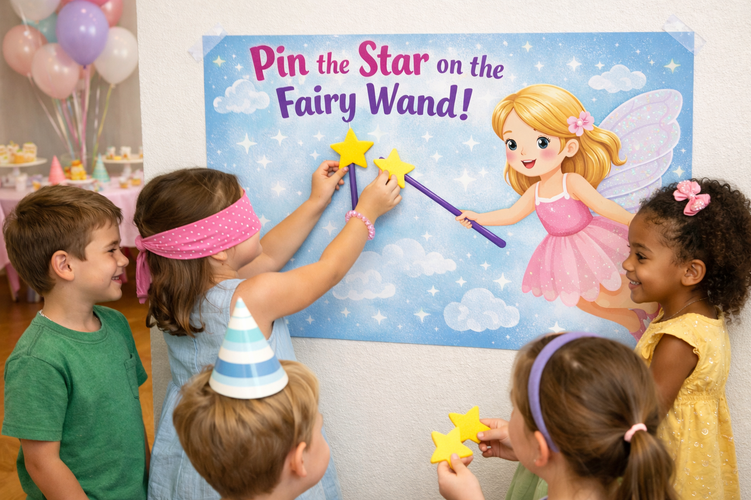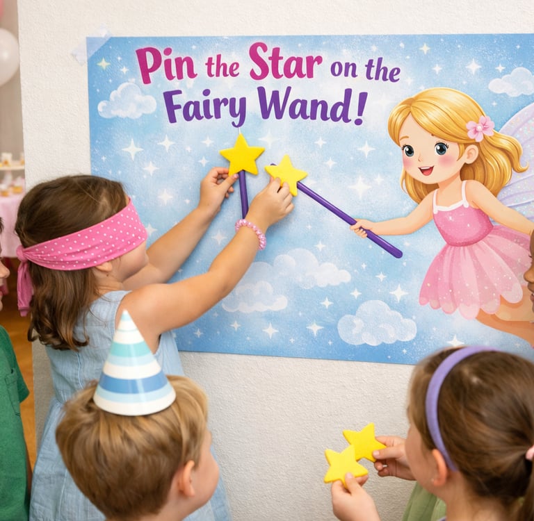 Pin the star on the fairy wand is a classic fairy party game where children try to place a star on the princess while blindfolded. This easy birthday activity is perfect for princess, fairy tale, or royal themed parties.