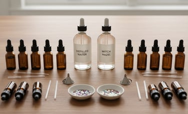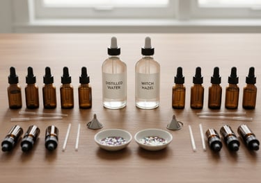 Next, for an easy day of set up, prepare the perfume base as well. Mix 50% distilled water and 50% witch hazel . If using 1 oz roller or spritzer that is 15 ml distilled water, 15 ml witch hazel