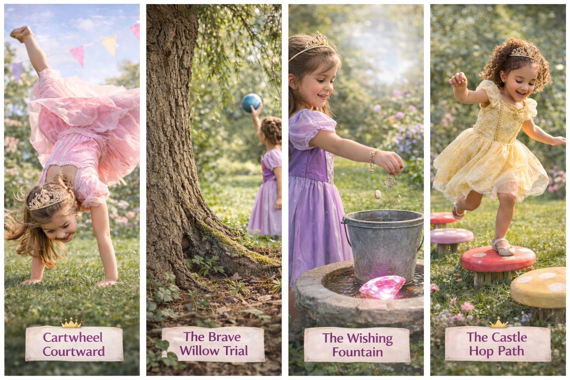 The Princess Action Quest is a magical movement scavenger hunt where kids complete royal challenges around the yard to earn their treasure. Perfect for princess birthday parties, this active game combines imagination, teamwork, and fun physical tasks like cartwheels, jumping stones, and wishing fountains.
