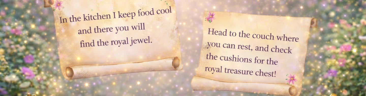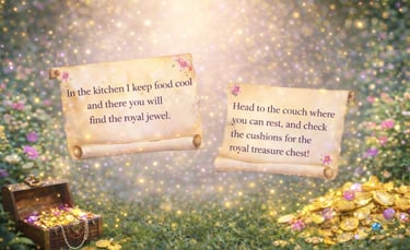 Sample Clue 6 "In the royal castle stories are told, Find the place where books unfold." Where to hide the next clue: By a bookshelf or reading area.