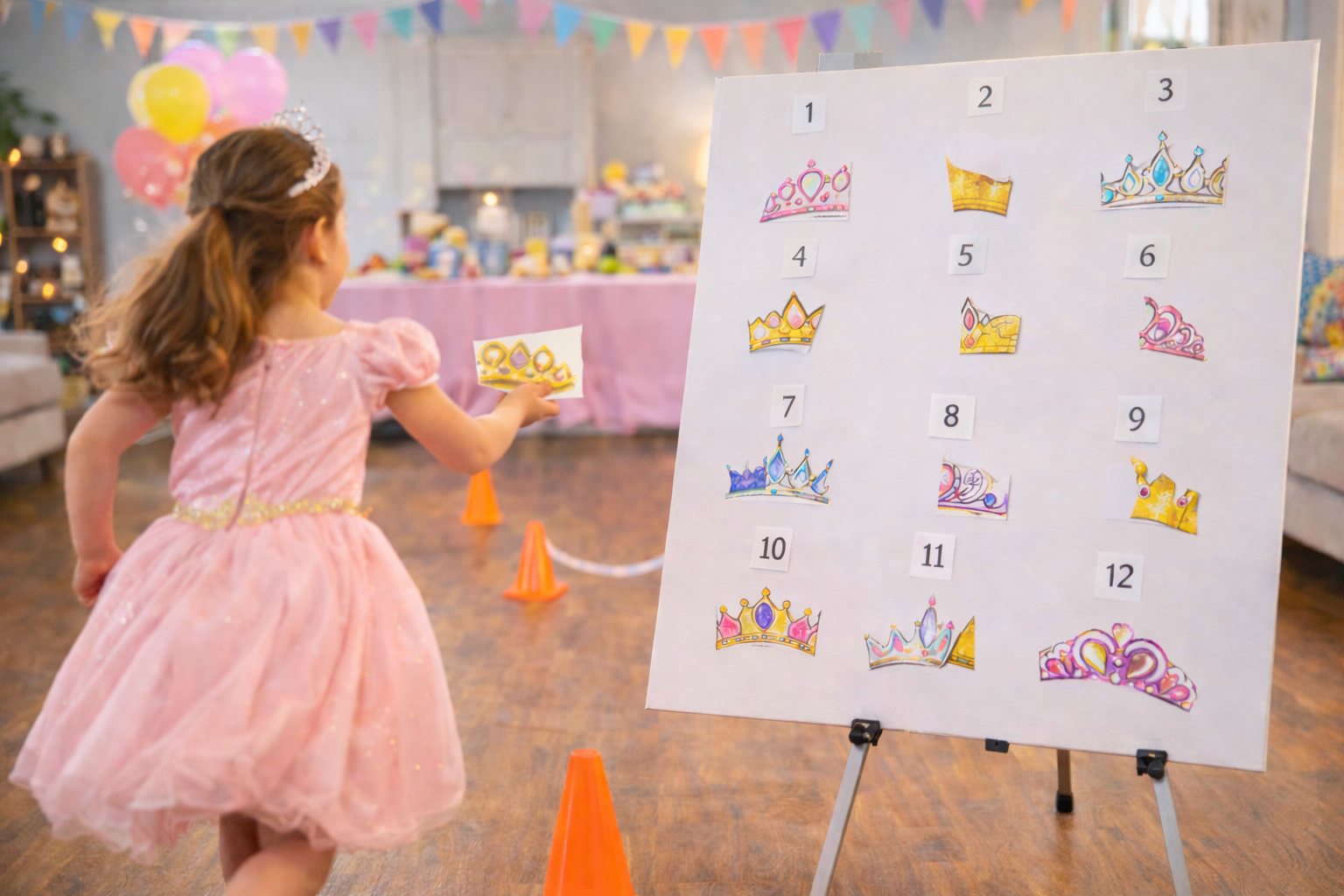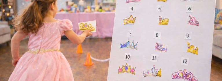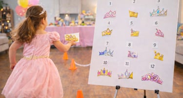 The Broken Crown Quest is a fun princess-themed relay race where kids run back and forth to match and rebuild magical crowns. In this energetic birthday party game, children race to find the correct crown halves and restore the royal tiaras on a poster board, combining movement, memory, and teamwork. Perfect for princess parties, fairy birthday celebrations, and kids' party games that keep everyone active and engaged.